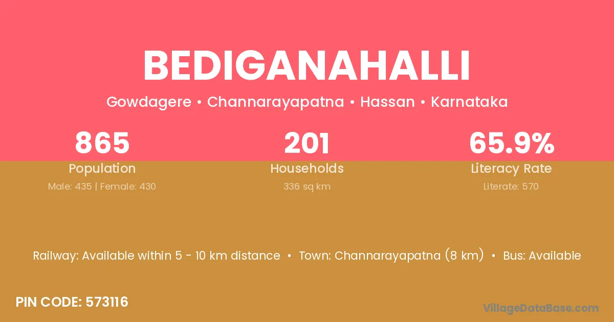 The literacy rate of Bediganahalli village is 78.44%. Male literacy stands at 85.30% and female literacy at 71.04%.