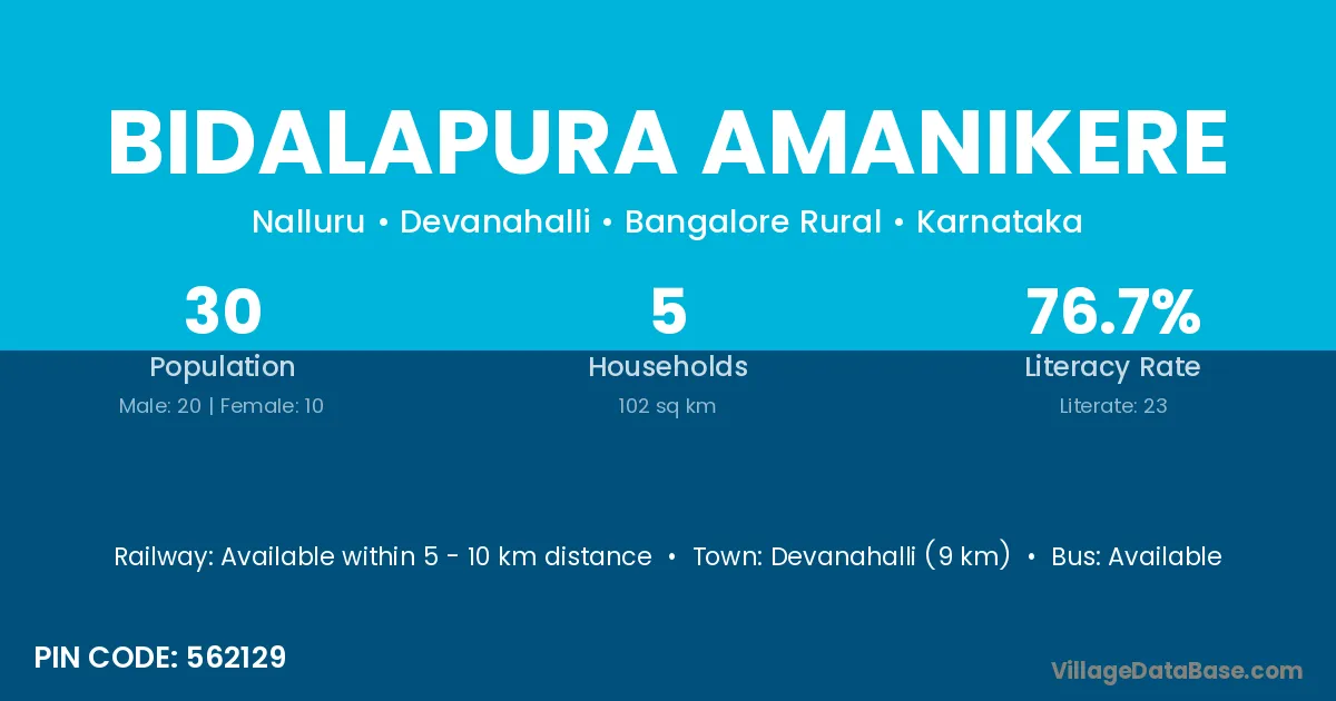 Devanahalli (9 km) is the nearest town to Bidalapura Amanikere village for major economic activities and is located approximately 9 km away.