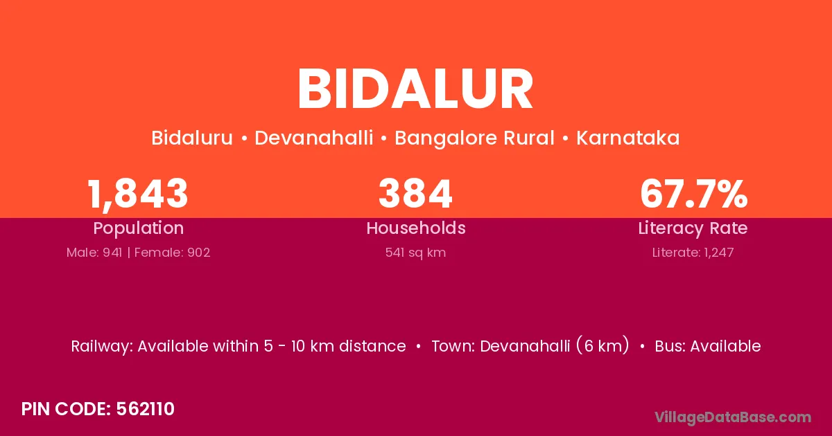Devanahalli (6 km) is the nearest town to Bidalur village for major economic activities and is located approximately 6 km away.