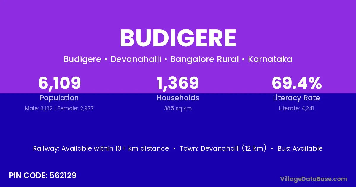 Budigere village has a total population of 6,109 people, of which 3,132 are males and 2,977 are females.