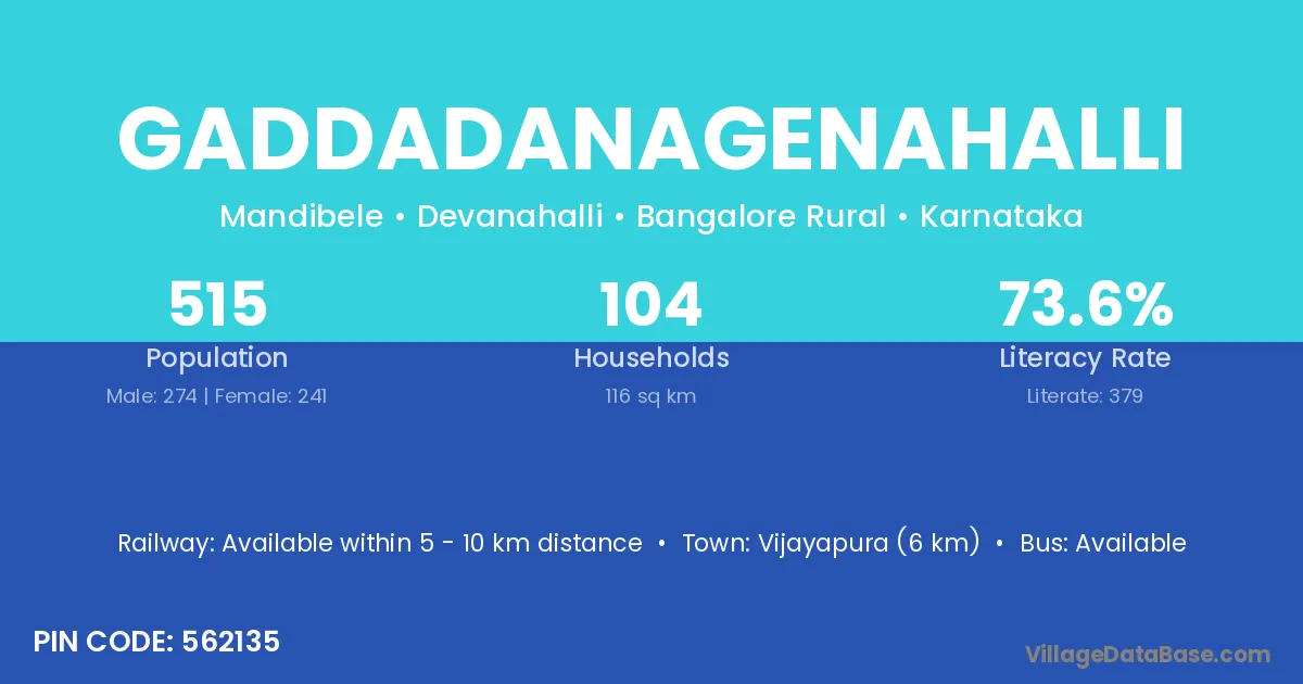 Vijayapura (6 km) is the nearest town to Gaddadanagenahalli village for major economic activities and is located approximately 6 km away.