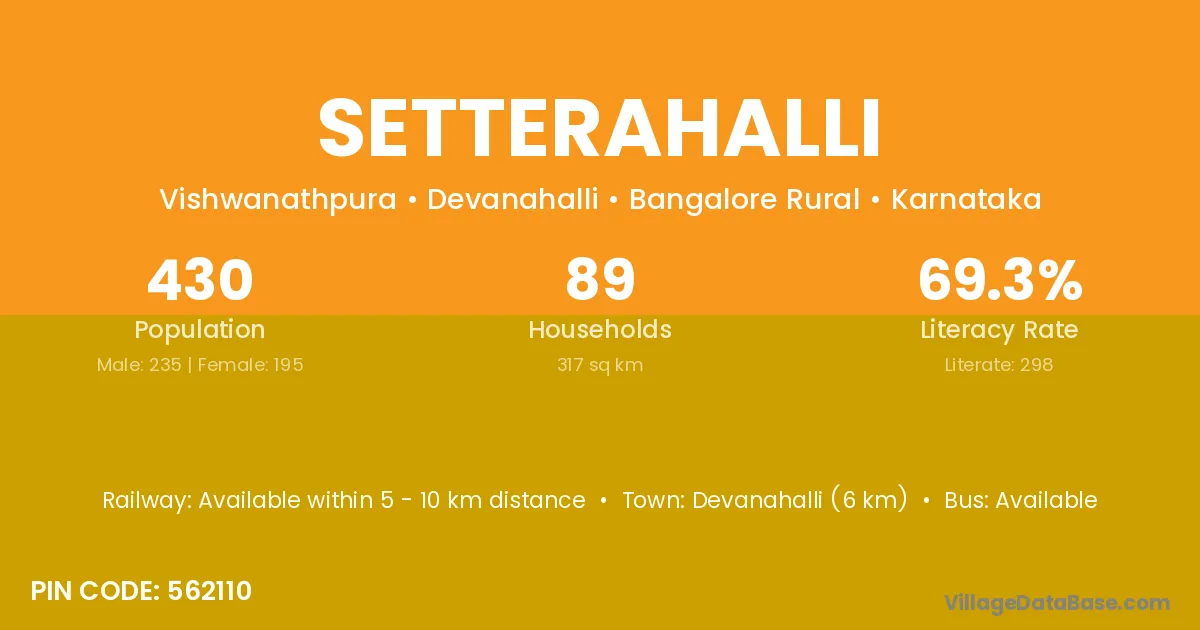 Devanahalli (6 km) is the nearest town to Setterahalli village for major economic activities and is located approximately 6 km away.
