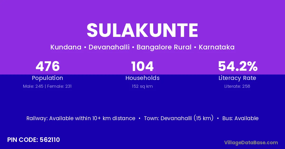 Sulakunte village has a total population of 476 people, of which 245 are males and 231 are females.