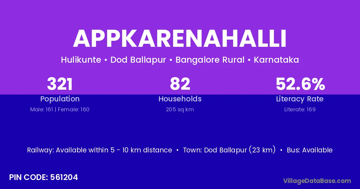 Dod Ballapur (23 km) is the nearest town to Appkarenahalli village for major economic activities and is located approximately 23 km away.