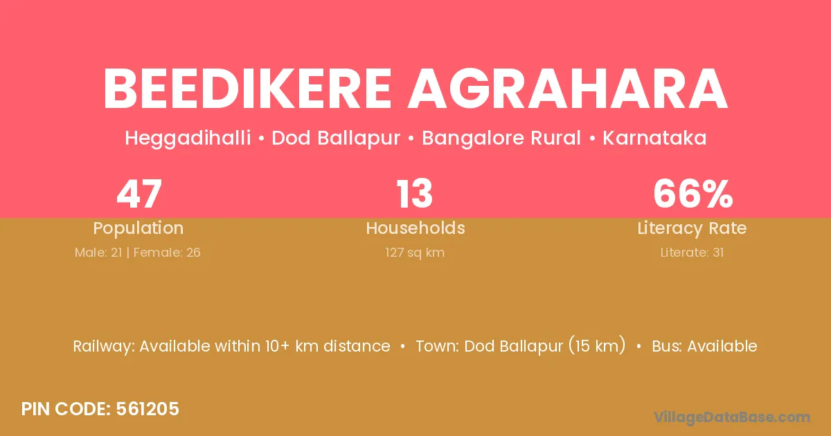 Dod Ballapur (15 km) is the nearest town to Beedikere Agrahara village for major economic activities and is located approximately 15 km away.