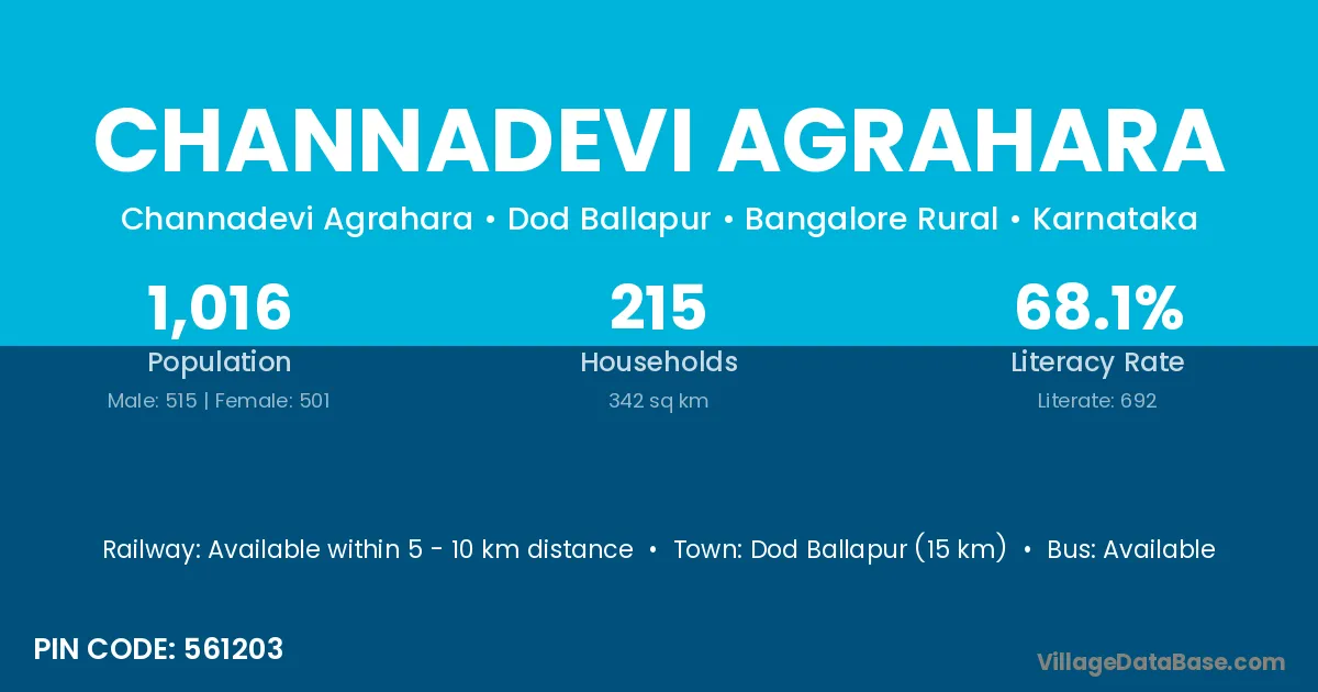 Dod Ballapur (15 km) is the nearest town to Channadevi Agrahara village for major economic activities and is located approximately 15 km away.
