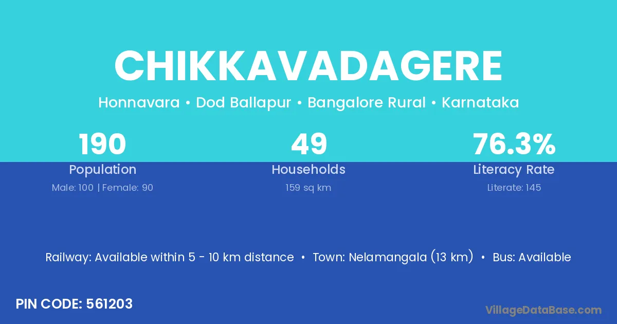 Nelamangala (13 km) is the nearest town to Chikkavadagere village for major economic activities and is located approximately 13 km away.