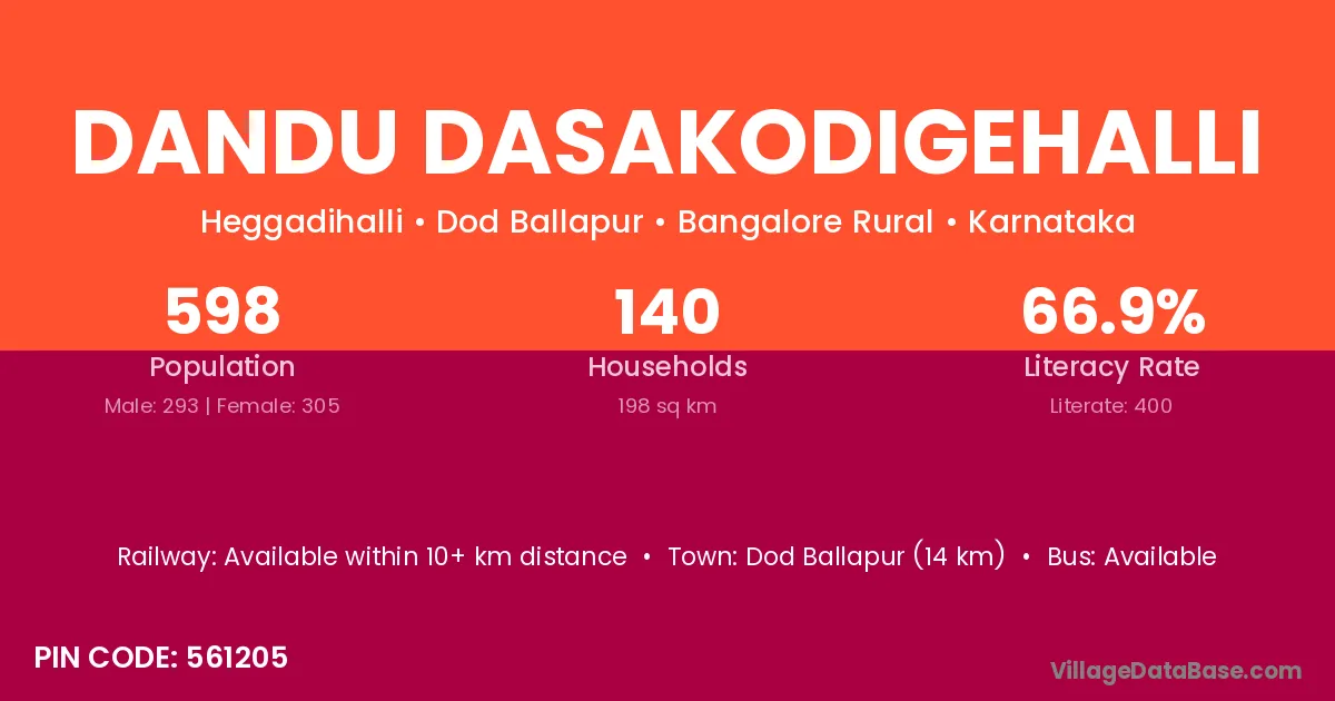 Dandu Dasakodigehalli village has a total population of 598 people, of which 293 are males and 305 are females.