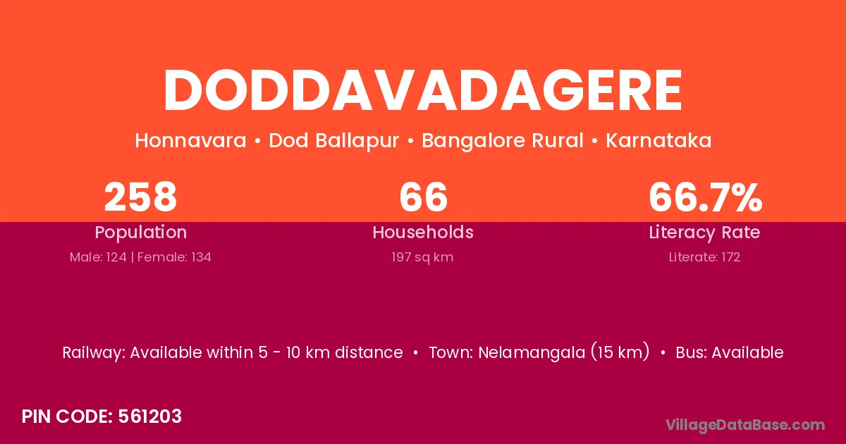 Nelamangala (15 km) is the nearest town to Doddavadagere village for major economic activities and is located approximately 15 km away.