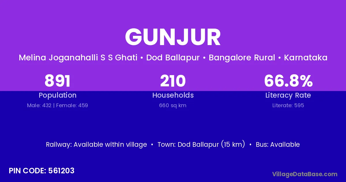 Dod Ballapur (15 km) is the nearest town to Gunjur village for major economic activities and is located approximately 15 km away.