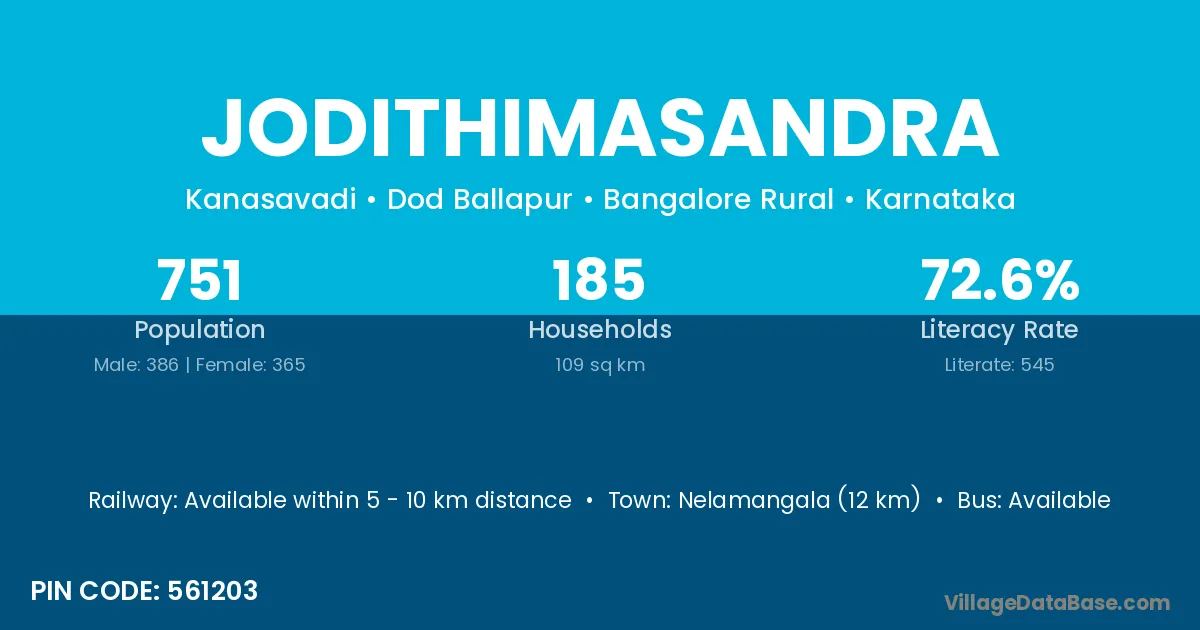 Nelamangala (12 km) is the nearest town to Jodithimasandra village for major economic activities and is located approximately 12 km away.