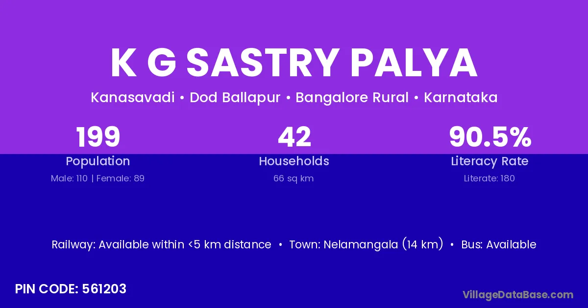 K G Sastry Palya village has a total population of 199 people, of which 110 are males and 89 are females.