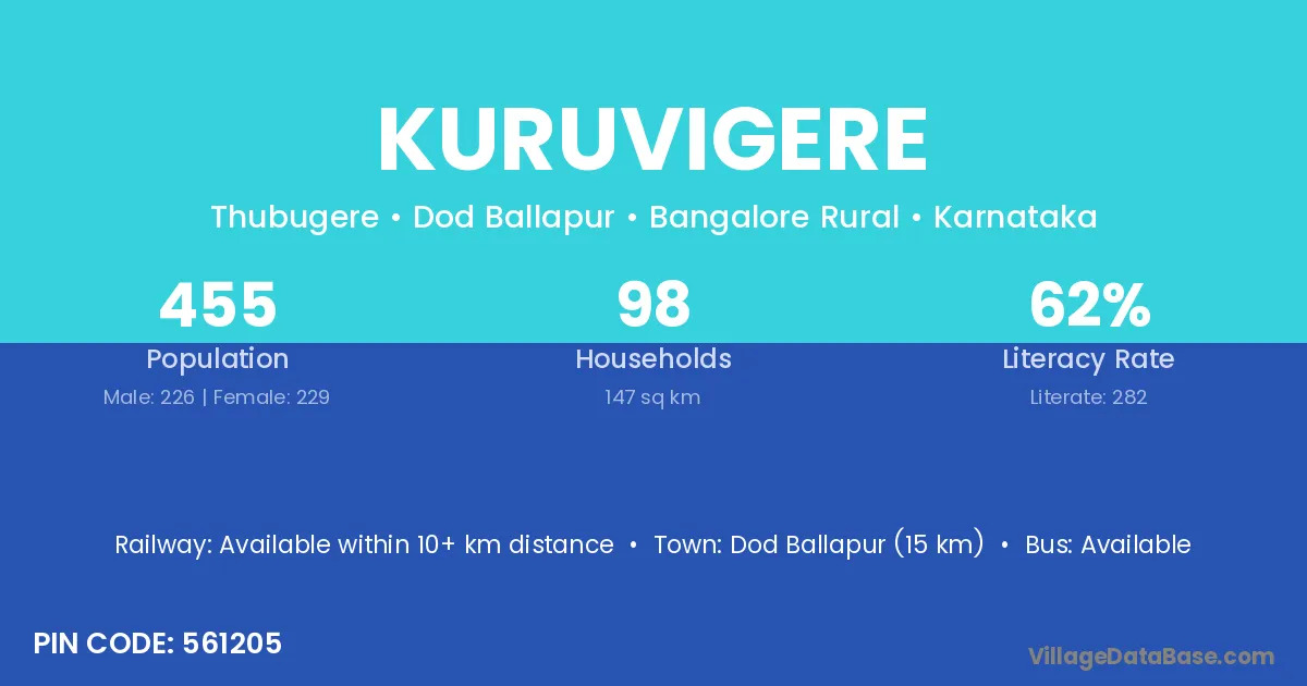 Dod Ballapur (15 km) is the nearest town to Kuruvigere village for major economic activities and is located approximately 15 km away.