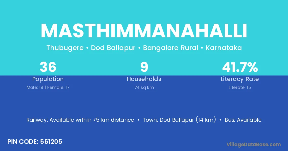 Masthimmanahalli village has a total population of 36 people, of which 19 are males and 17 are females.