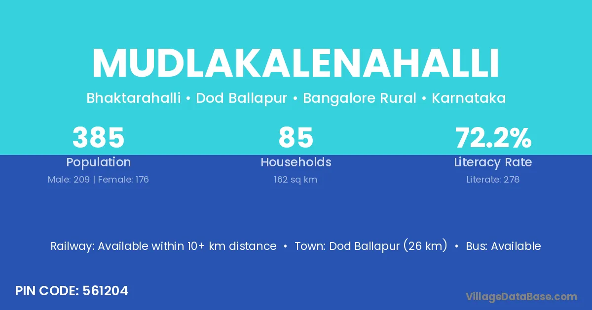 Dod Ballapur (26 km) is the nearest town to Mudlakalenahalli village for major economic activities and is located approximately 26 km away.