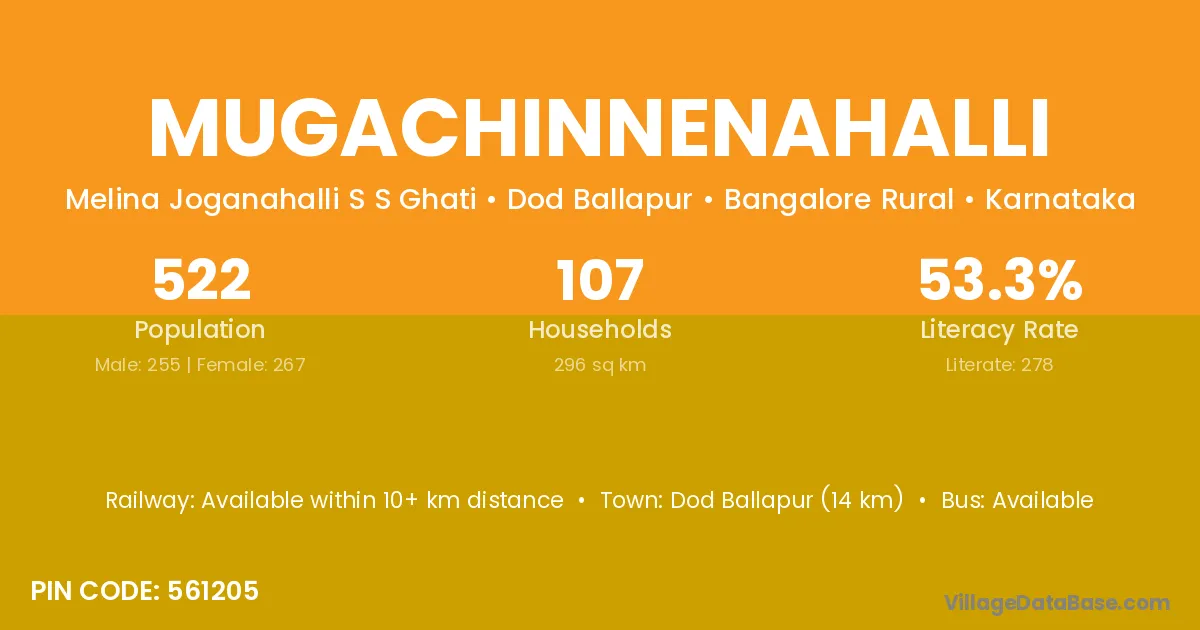 Dod Ballapur (14 km) is the nearest town to Mugachinnenahalli village for major economic activities and is located approximately 14 km away.