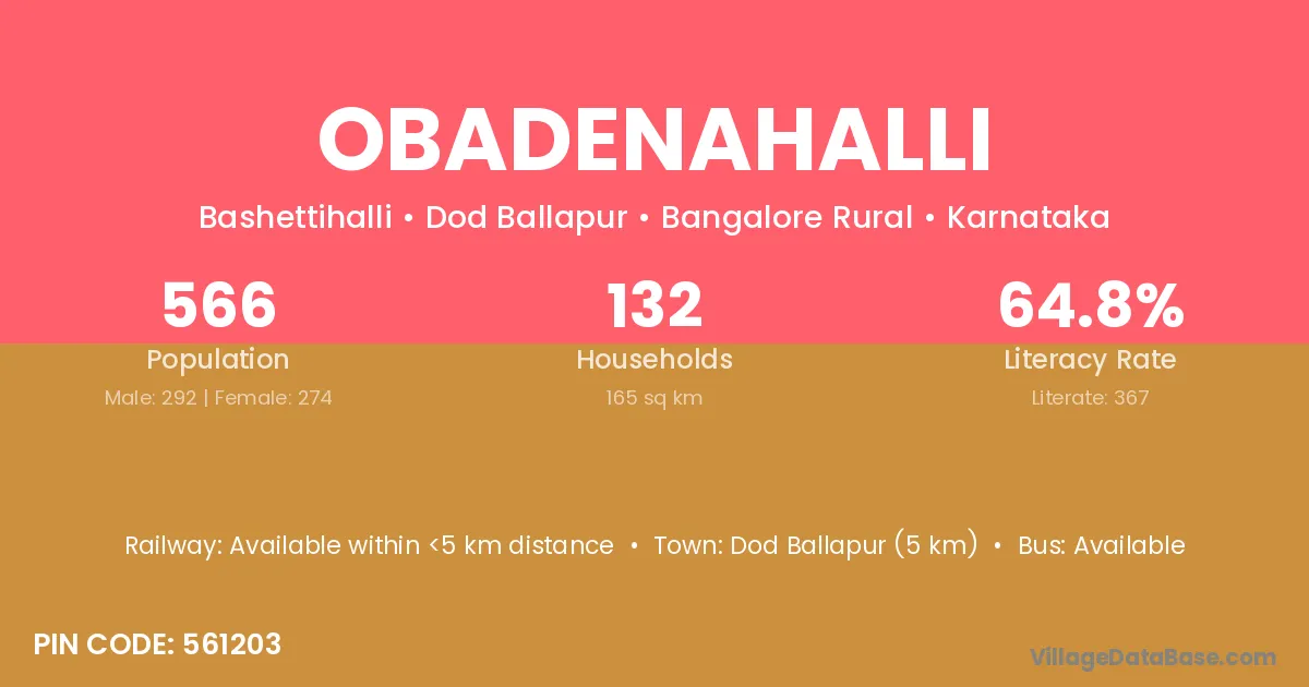 Dod Ballapur (5 km) is the nearest town to Obadenahalli village for major economic activities and is located approximately 5 km away.