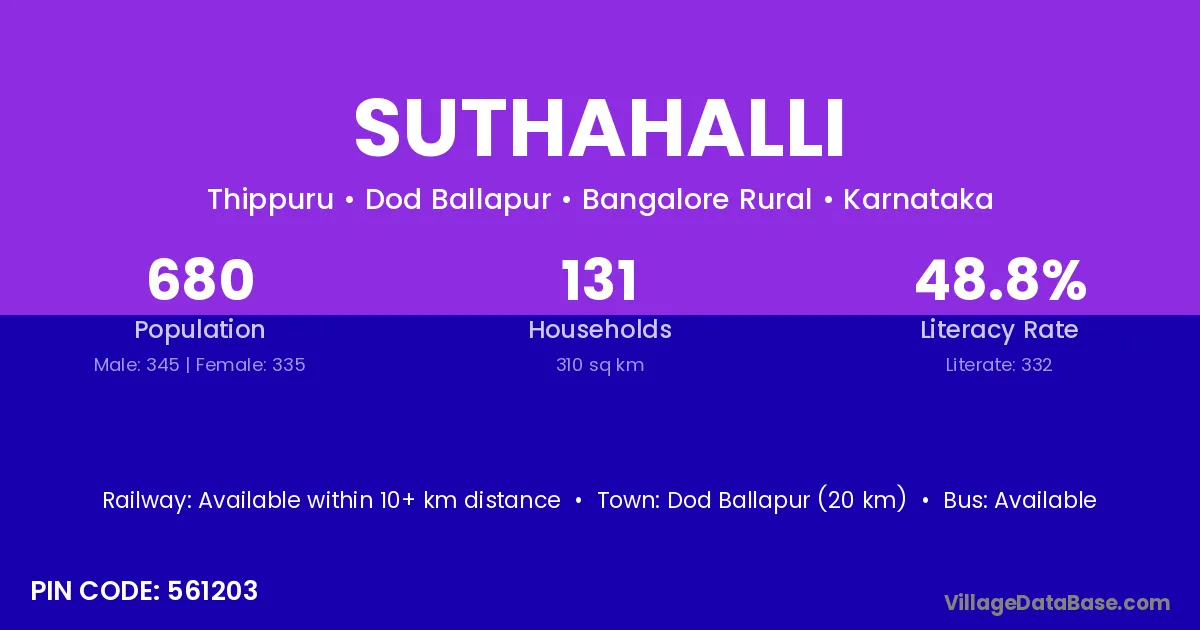 Dod Ballapur (20 km) is the nearest town to Suthahalli village for major economic activities and is located approximately 20 km away.