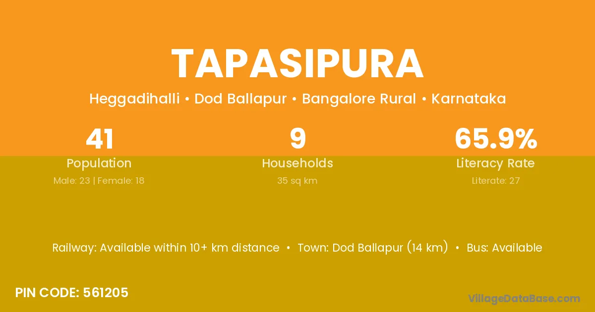 Dod Ballapur (14 km) is the nearest town to Tapasipura village for major economic activities and is located approximately 14 km away.
