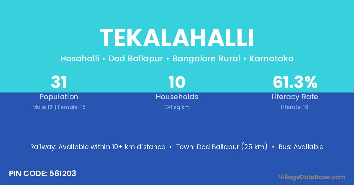 Dod Ballapur (25 km) is the nearest town to Tekalahalli village for major economic activities and is located approximately 25 km away.