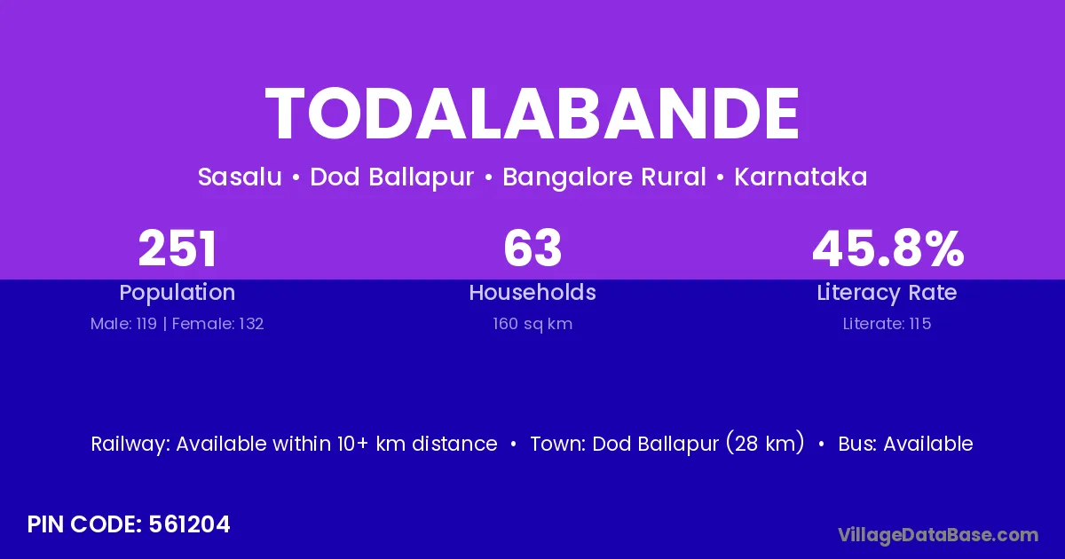 Dod Ballapur (28 km) is the nearest town to Todalabande village for major economic activities and is located approximately 28 km away.
