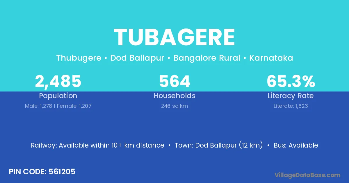 Dod Ballapur (12 km) is the nearest town to Tubagere village for major economic activities and is located approximately 12 km away.
