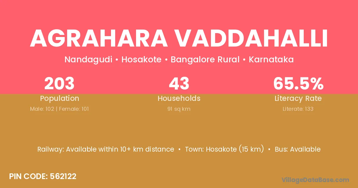 Agrahara Vaddahalli village has a total population of 203 people, of which 102 are males and 101 are females.