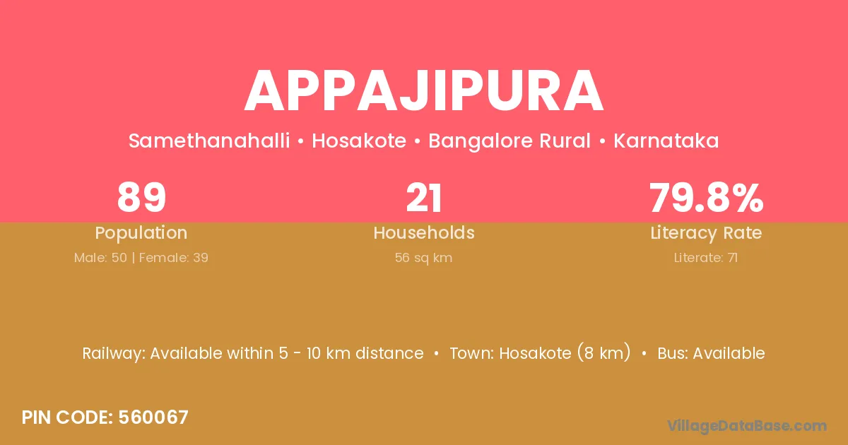 Hosakote (8 km) is the nearest town to Appajipura village for major economic activities and is located approximately 8 km away.