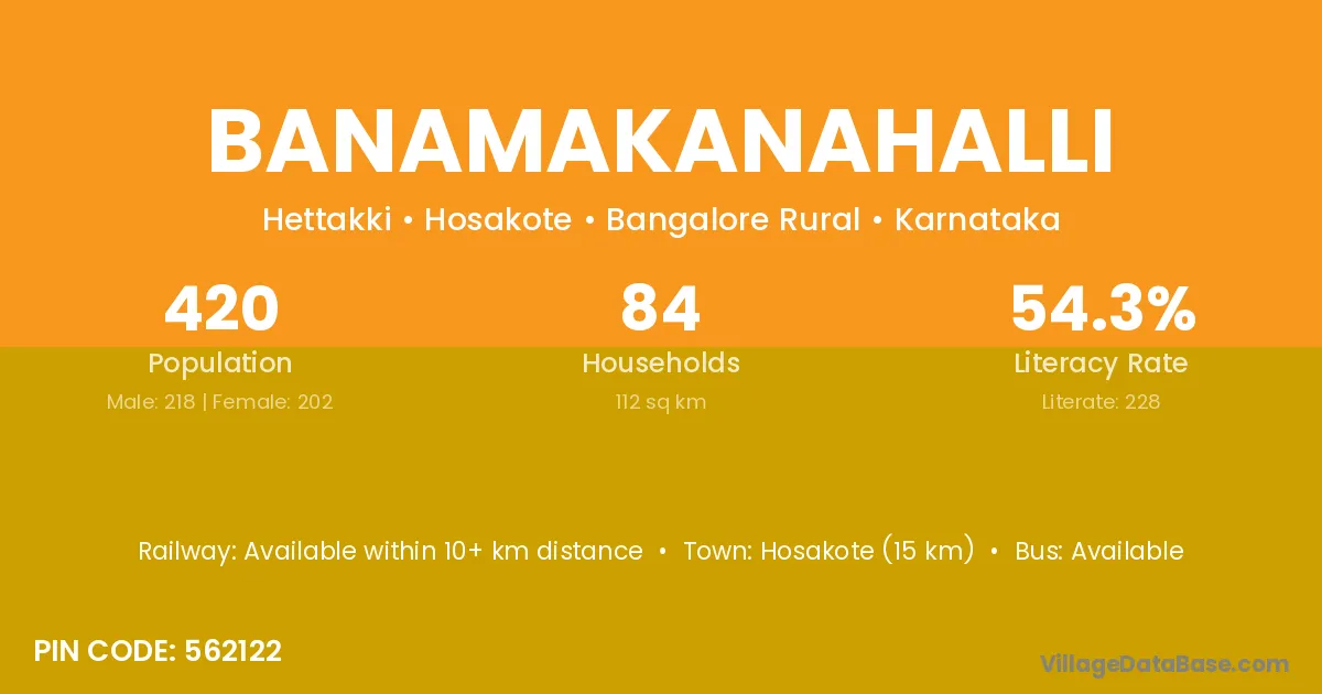Hosakote (15 km) is the nearest town to Banamakanahalli village for major economic activities and is located approximately 15 km away.