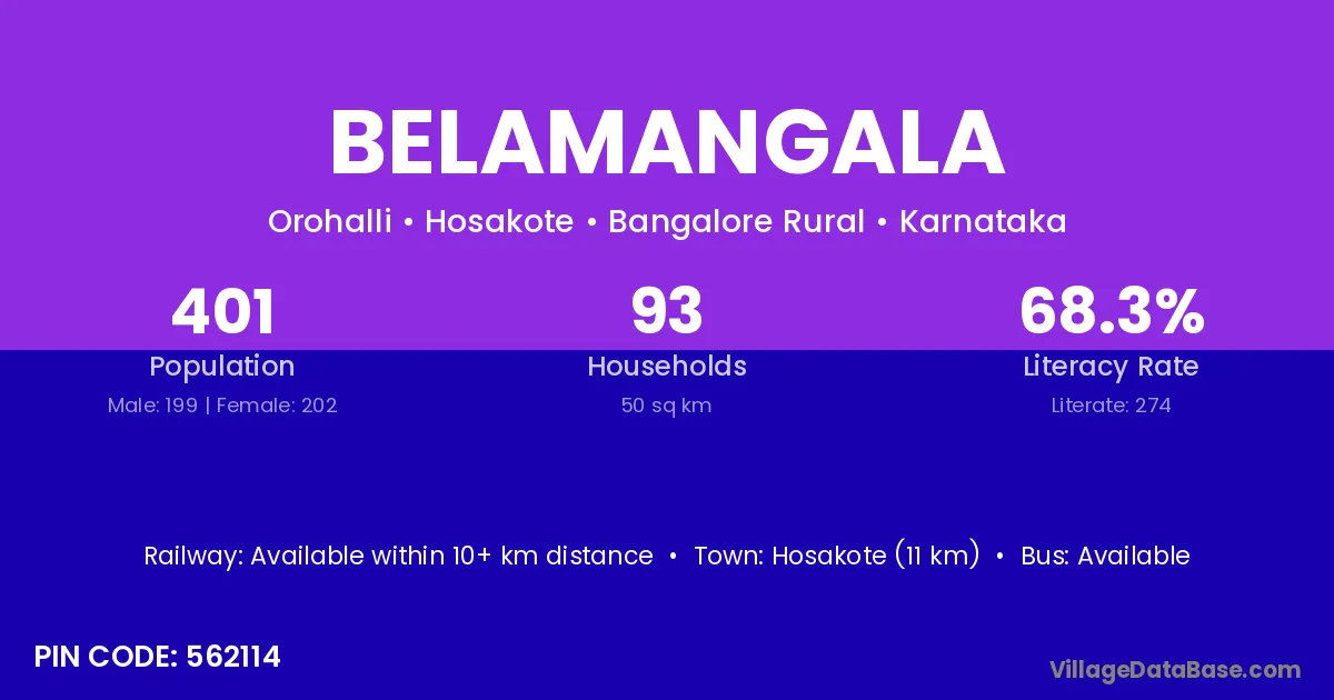 Belamangala village has a total population of 401 people, of which 199 are males and 202 are females.