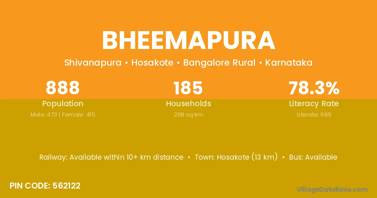 Hosakote (13 km) is the nearest town to Bheemapura village for major economic activities and is located approximately 13 km away.