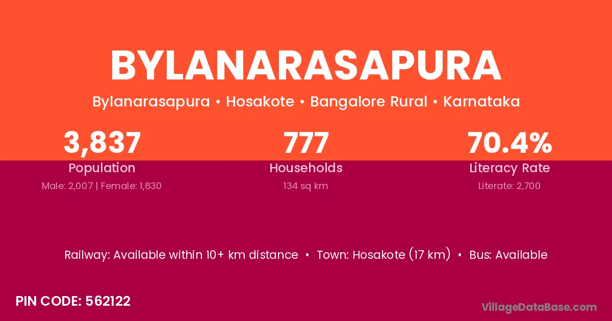 Hosakote (17 km) is the nearest town to Bylanarasapura village for major economic activities and is located approximately 17 km away.