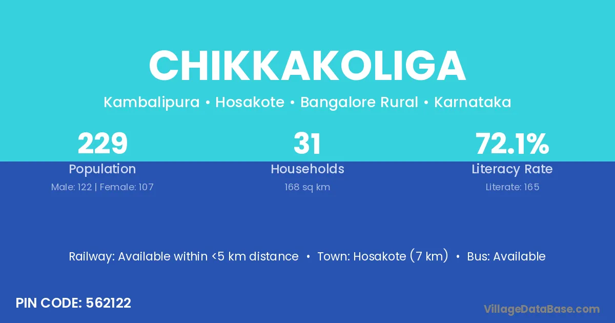 Chikkakoliga village has a total population of 229 people, of which 122 are males and 107 are females.