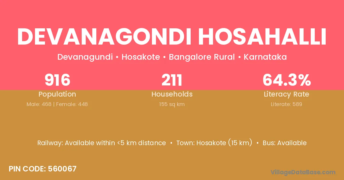 Hosakote (15 km) is the nearest town to Devanagondi Hosahalli village for major economic activities and is located approximately 15 km away.