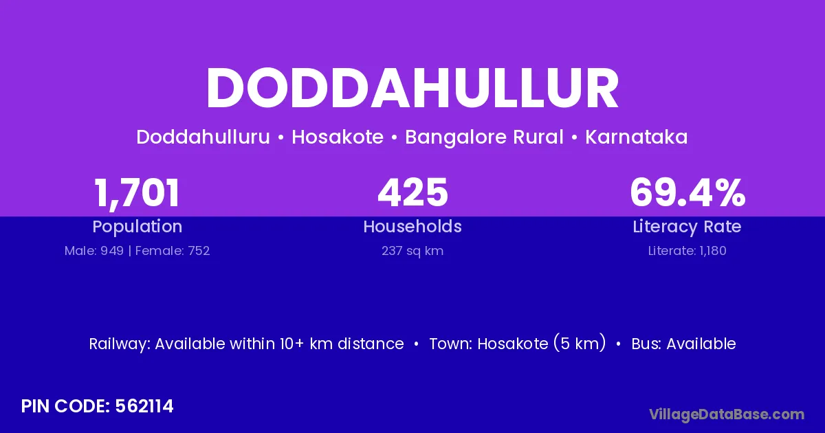 Hosakote (5 km) is the nearest town to Doddahullur village for major economic activities and is located approximately 5 km away.