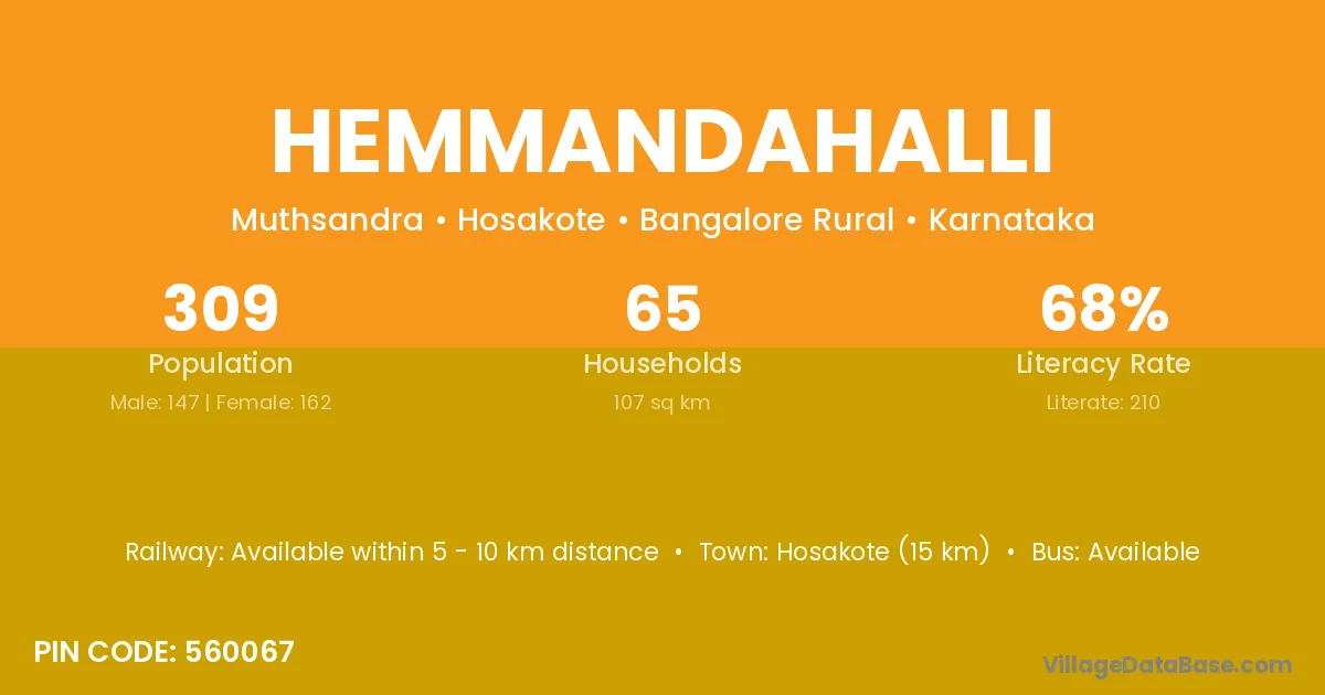 Hosakote (15 km) is the nearest town to Hemmandahalli village for major economic activities and is located approximately 15 km away.