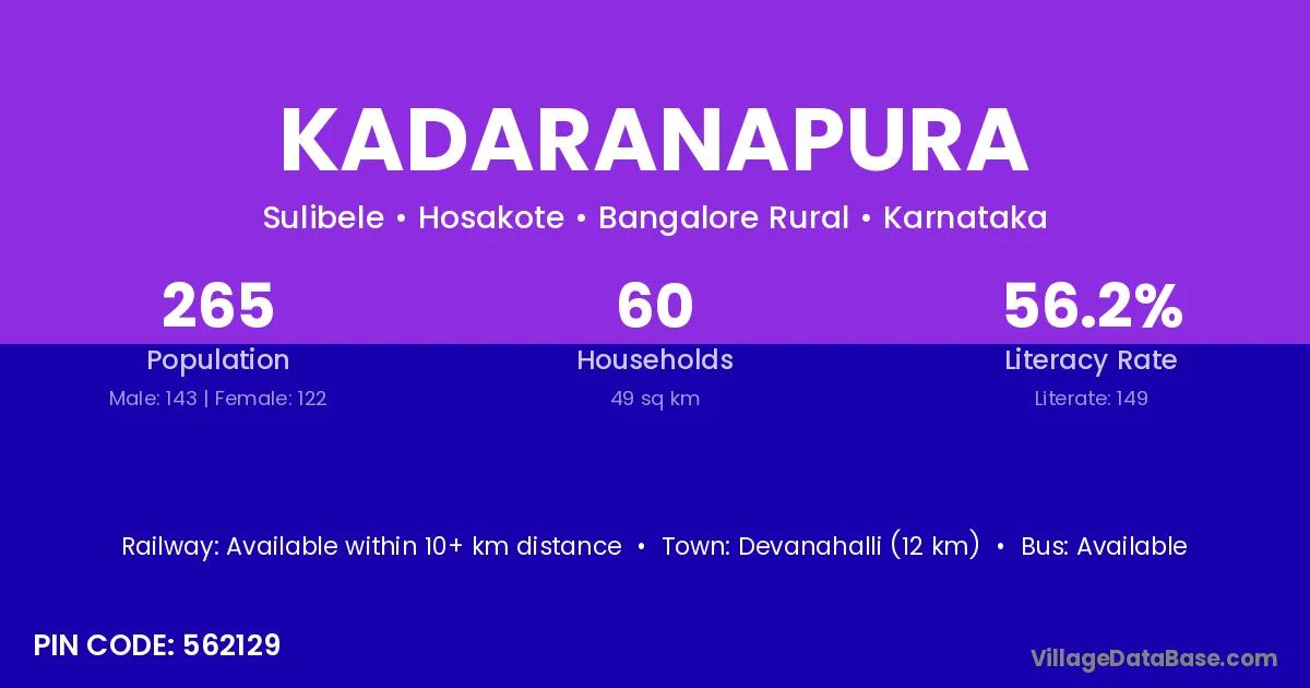 Devanahalli (12 km) is the nearest town to Kadaranapura village for major economic activities and is located approximately 12 km away.