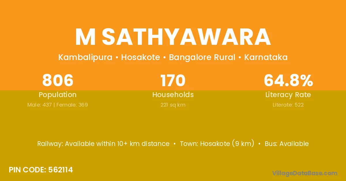 Hosakote (9 km) is the nearest town to M Sathyawara village for major economic activities and is located approximately 9 km away.