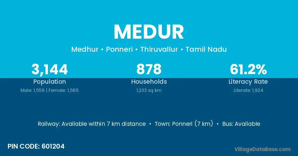 The literacy rate of Medur village is 58.26%. Male literacy stands at 66.10% and female literacy at 50.00%.