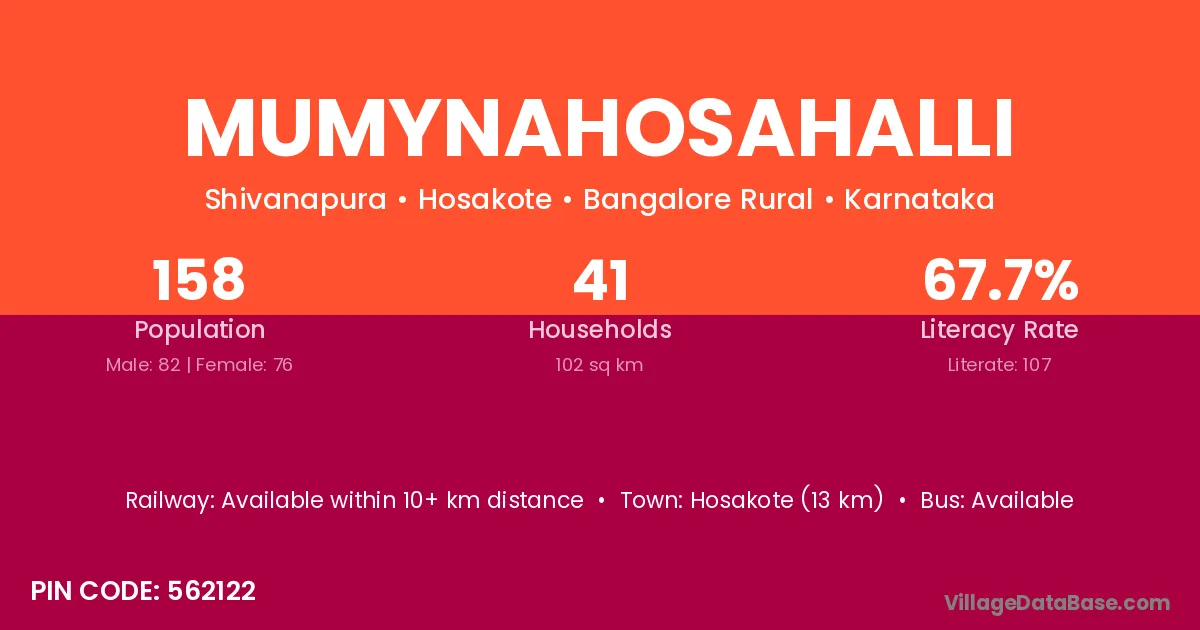 Hosakote (13 km) is the nearest town to Mumynahosahalli village for major economic activities and is located approximately 13 km away.
