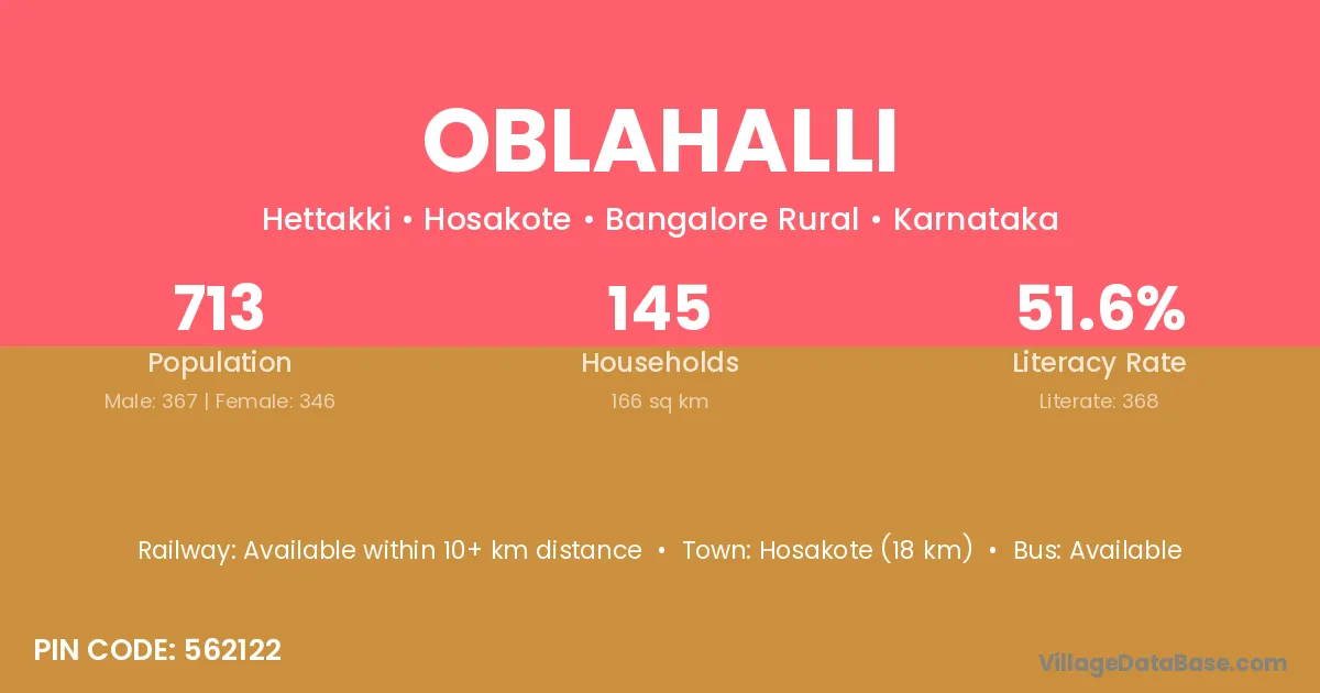 Hosakote (18 km) is the nearest town to Oblahalli village for major economic activities and is located approximately 18 km away.