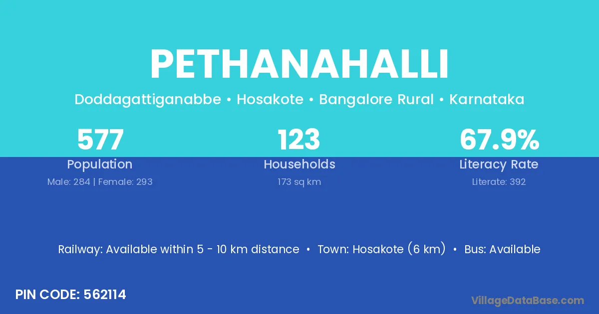 Pethanahalli village has a total population of 577 people, of which 284 are males and 293 are females.