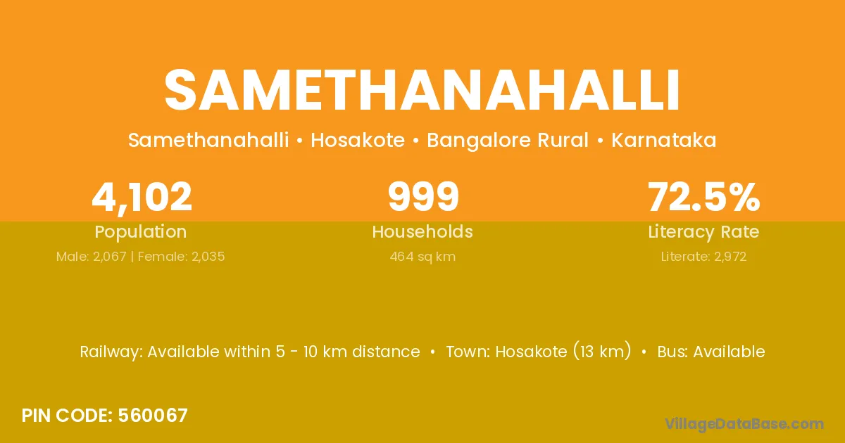 Hosakote (13 km) is the nearest town to Samethanahalli village for major economic activities and is located approximately 13 km away.