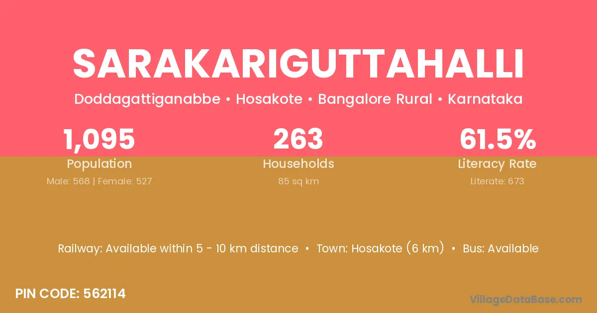 Hosakote (6 km) is the nearest town to Sarakariguttahalli village for major economic activities and is located approximately 6 km away.