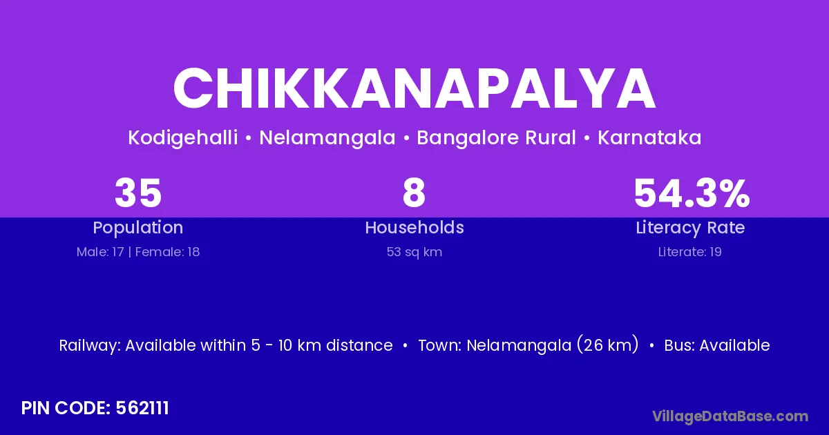 Nelamangala (26 km) is the nearest town to Chikkanapalya village for major economic activities and is located approximately 26 km away.
