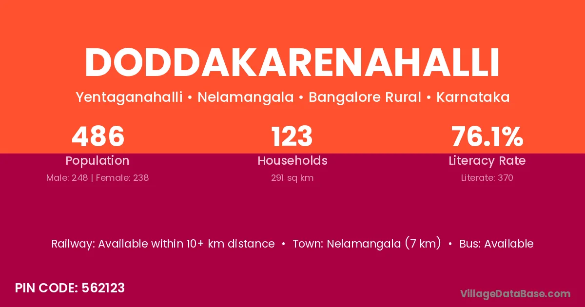 Doddakarenahalli village has a total population of 486 people, of which 248 are males and 238 are females.