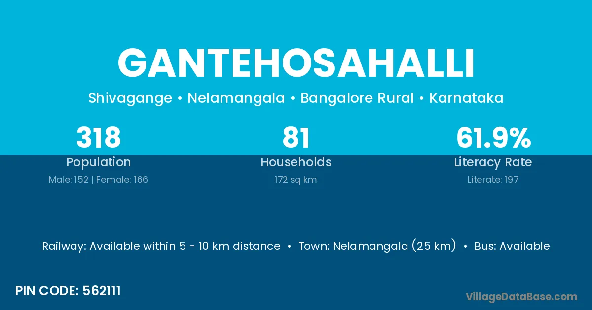Nelamangala (25 km) is the nearest town to Gantehosahalli village for major economic activities and is located approximately 25 km away.