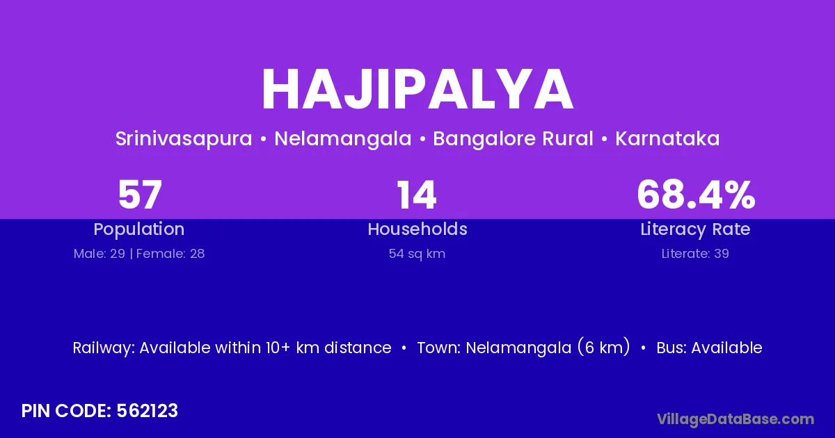 Nelamangala (6 km) is the nearest town to Hajipalya village for major economic activities and is located approximately 6 km away.