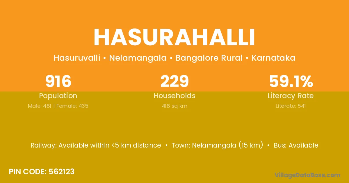 Nelamangala (15 km) is the nearest town to Hasurahalli village for major economic activities and is located approximately 15 km away.