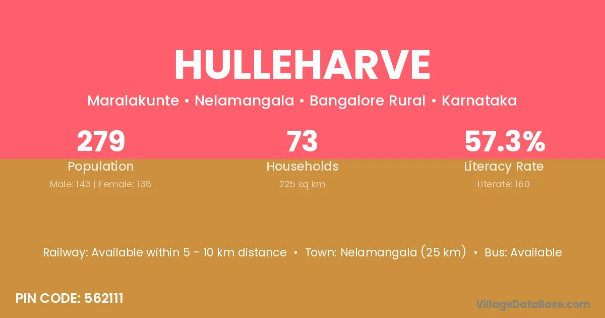 Nelamangala (25 km) is the nearest town to Hulleharve village for major economic activities and is located approximately 25 km away.